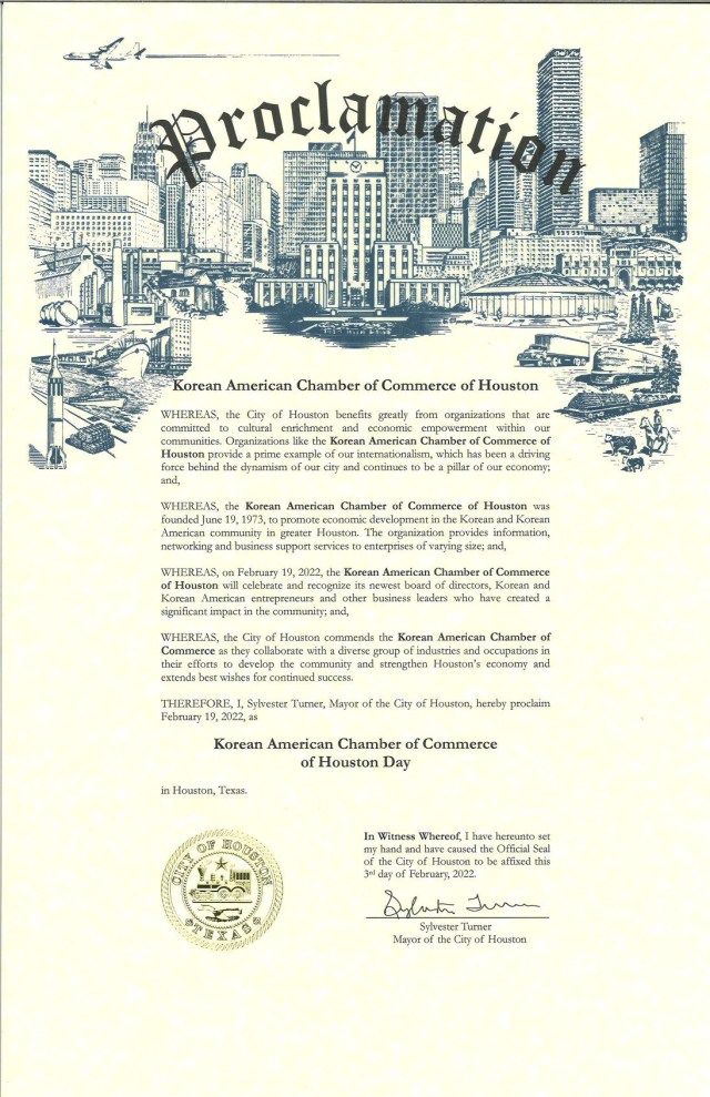 THEREFORE, I, Sylvester Turner, Mayor of the City of Houston, hereby proclaim February 19, 2022, as Korean American Chamber of Commerce of Houston Day in Houston, Texas.